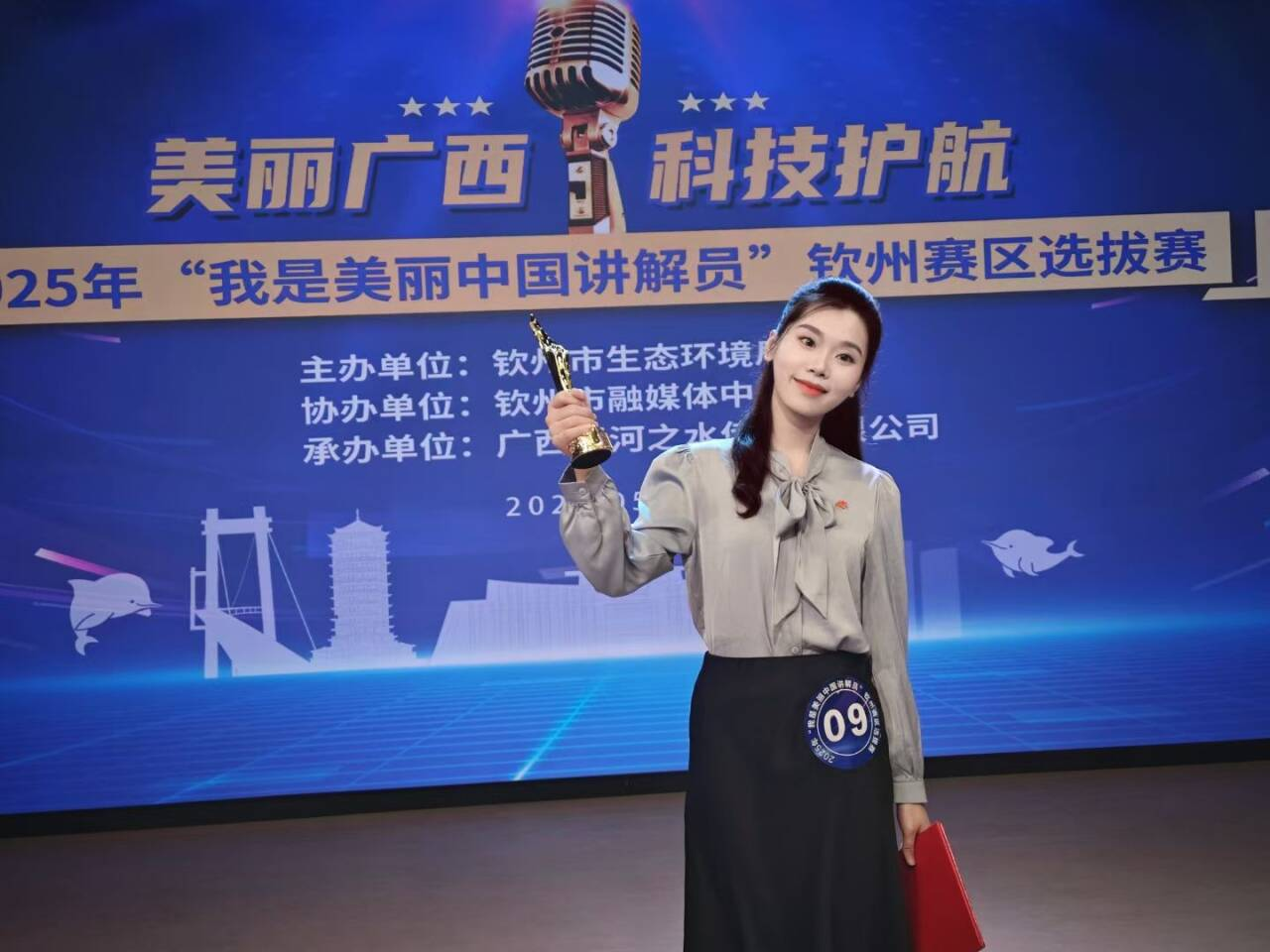 5月14日晚,2025年“我是美丽中国讲解员”钦州赛区选拔赛在市融媒体中心举行。赛事由市生态环境局主办、市融媒体中心协办、广西运河之水传媒有限公司承办,来自全市生态环境系统及各有关部门(单位)、高校共15名选手同台竞技,由陈一红老师指导的讲解员莫媛婷脱颖而出,斩获赛区一等奖。